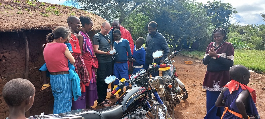 Plany na dzisiejszy dzień, to jest 29 kwietnia były zupełnie inne. Mieliśmy wstać przed 6:00 rano, żeby pojechać do małej miejscowości Laiseri, w której miała się odbyć msza święta. Rano 6:10 gotowi do drogi czekamy na księdza Kazka. Ksiądz zjawia się i oznajmia, że nastąpiła nagła zmiana planów, ponieważ musi zawieźć do Gairo chore dziecko do lekarza. Powiedział, że wróci i około 7:00 rano, odprawi mszę świętą i rzeczywiście tak było. Po śniadaniu Stefan z Marią zajęli się przygotowywaniem wniosków potrzebnych do Urzędu Stanu Cywilnego wybrali się do …(STEFAN: Godiego, ale nie bardzo się wybrali, bo to było tak czy inaczej na plebanii) żeby dowiedzieć się jakie to konkretnie muszą być papiery do złożenia …(ten fragment tekstu czeka na korektę Stefana – STEFAN: logowaliśmy się na stronę RITY i staraliśmy się zorientować, jakie papiery gościu nam polecił złożyć elektronicznie w urzędzie. Co chwilę wychodził jakiś problem – albo coś trzeba było złożyć 3 tygodnie przed datą ślubu, albo po ślubie, albo trzeba było załączyć dokumenty, których nie mieliśmy. Dzień wcześniej Kazek i Maria usłyszeli od urzędnika, co powinniśmy złożyć, ale okazało się, że jednak nie bardzo wiedzą co.. Ja się od tego trochę odciąłem, bo cała gadka w urzędzie była w Suahili). Asia i ja w tym czasie ściągałyśmy zdjęcia zrobione z kilku dni w Tanzanii. Miałyśmy czas na spokojne wypicie kawy. Kiedy wrócili, zostaliśmy zaproszeni na obiad, który zrobiła siostra Marii, Mahoo. Kiedy zjawiliśmy się na miejscu, wszystkie siostry otoczyły nas i zaczęły przebierać w nasze masajskie, odświętne stroje, dopasowując rozmiar paska i układając warstwami na nas ich tradycyjne materiały. Po przebierankach ustawiono plastikowy stół i cztery plastikowe krzesła: dla Stefana, Marii, Asi i mnie. Dziwny mają zwyczaj, że goście jedzą przy stole samotnie – bez gospodarzy. Pierwszego dnia, kiedy Mahoo karmiła nas dwa razy, siedziałyśmy z Asią przy stole same naprzeciwko siebie. Pomyślałam, że spóźniłyśmy się, bo poszłyśmy po zabawki dla dzieci. Najpierw jedliśmy tradycyjne placki trochę przypominające naleśniki tylko bardziej twarde (STEFAN: chapati). Na obiad była zupa a la rosół, ale bez warzyw tylko samo mięso z wodą, kukurydziana papka (ugali – STEFAN: rodzaj polenty, mamałygi) i mięso z kozy oraz banany. Po spożyciu posiłku Stefan wyciągnął drona i zabawiał wszystkich ujęciami robionymi z góry. Otoczony przez grono osób, nie tylko dzieci.