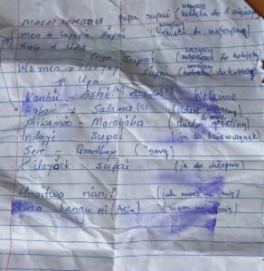 Nie wiem, czy ktoś z tego coś zrozumie, trochę zużyta kartka, ale to jest moja notatka z pierwszej lekcji masajskiego (STEFAN: wymieszanego z suahili).